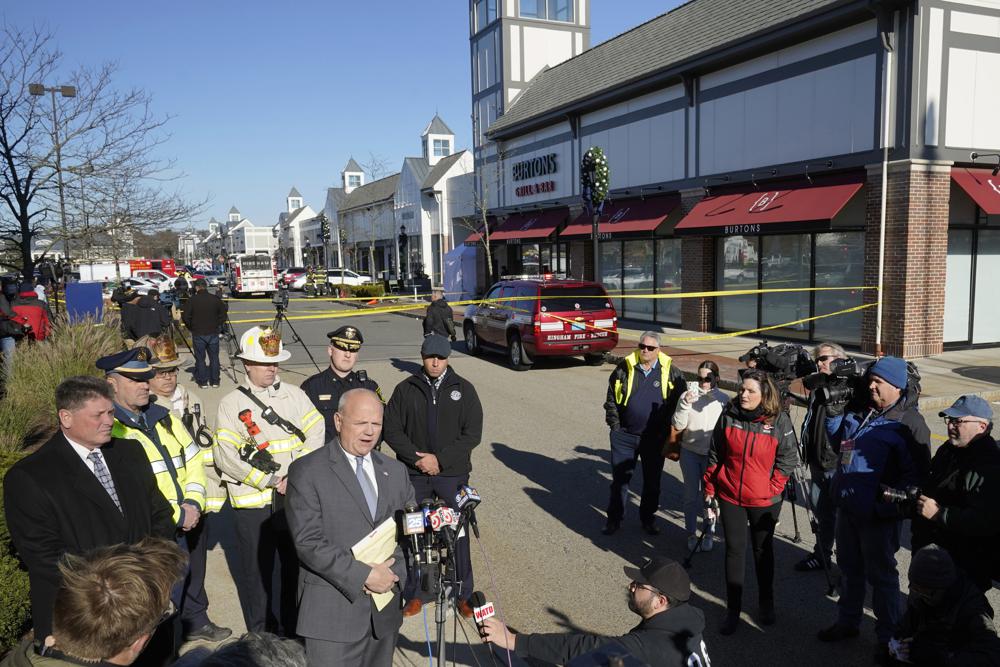 Plymouth County District Attorney Timothy Cruz, center left, speaks to reporters near a scene where an SUV crashed into Apple store, Monday, Nov. 21, 2022, in Hingham, Mass. At least one person was killed and multiple others were injured Monday when the SUV crashed into the store, authorities said. (AP Photo/Steven Senne)