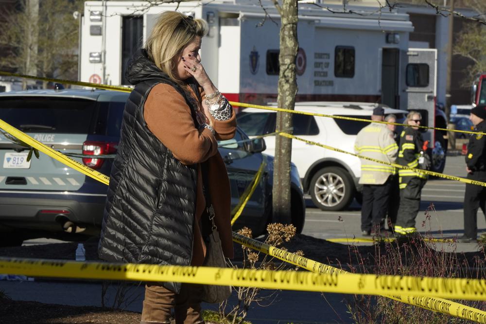 A woman is tearful while standing behind police tape at a scene where an SUV drove into an Apple store, Monday, Nov. 21, 2022, in the Derby Street Shops, in Hingham, Mass. One person was killed and multiple others were injured Monday when the SUV crashed into the store, authorities said. (AP Photo/Steven Senne)