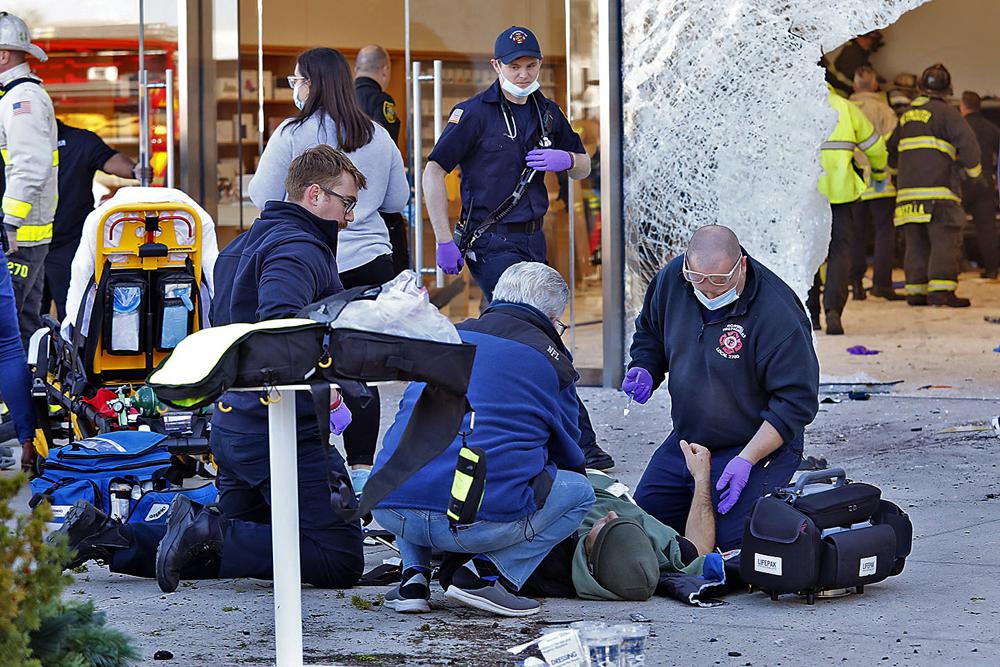 Emergency workers aid injured shoppers after an SUV drove into an Apple store, Monday, Nov. 21, 2022, in Hingham, Mass. Several people were injured in the incident, according to authorities. (Greg Derr/The Patriot Ledger via AP) BOSTON OUT
