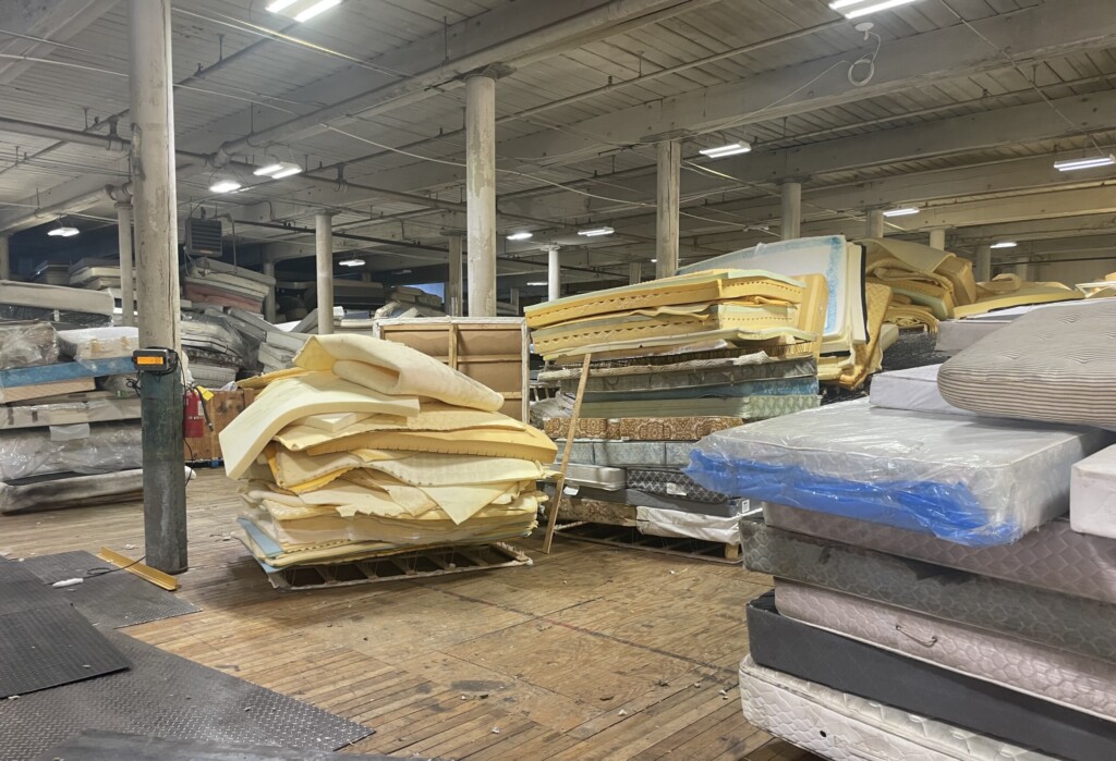 Mattresses are seen piling up inside HandUp Mattress Recycling in New Bedford. (WLNE)