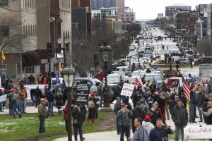 Kelly Mullin, who stood near a “don’t tread on me” flag spread on the grass near the governor’s mansion, said she brought her sons to the event to teach them a lesson about liberty.