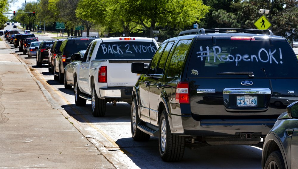 But it’s not just Democratic governors feeling the heat. A procession of cars swarmed around the Republican-dominated statehouse in Oklahoma City on Wednesday, with messages written on windows or signs that said “stop killing our economy,” “we need our church” and “time 2 work.”