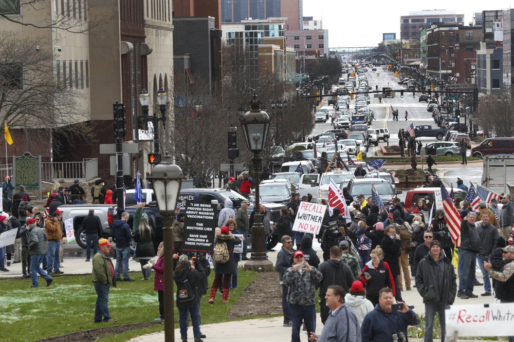 But the president and some of his supporters are impatient. Thousands of people in their cars packed the streets of Lansing to protest Democratic Gov. Gretchen Whitmer’s stay-at-home order and other restrictions. Outside the Capitol, some chanted “Lock her up,” a throwback to Trump’s calls during the 2016 election about his rival Hillary Clinton. One woman held a sign reading “Heil Whitmer.”