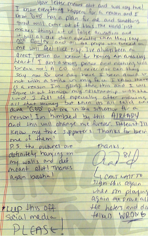By News Staff News@abc6.us-east-1.rayoscms.net Twitter: @ABC6 TMZ obtain a letter Aaron Hernandez sent to his pen pal which he more then likely won't write to again. In the letter shown Hernandez claims he is not guilty