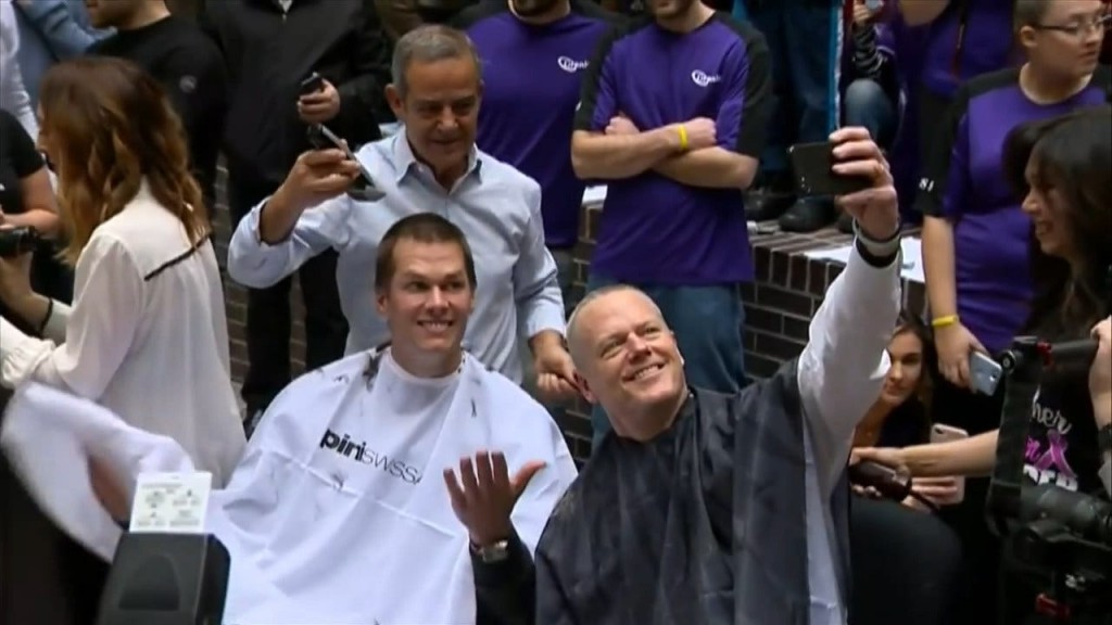 Tom Brady and Massachusetts Governor Charlie Baker seen smiling big for a selfie after shaving off their hair to raise money for Dana Farber Cancer Institute Thursday morning. The two joined hundr...