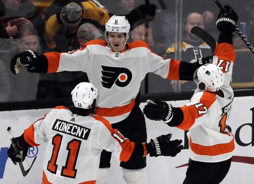 Travis Sanheim scored a power-play goal 2:56 into overtime and the Philadelphia Flyers beat the Boston Bruins 3-2 on Thursday night to extend their season-best winning streak to six.
